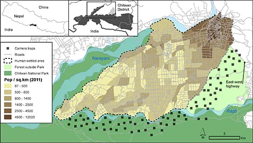 Study site in Chitwan, Nepal. Camera traps were placed inside Chitwan National Park and a multiple-use forest corridor outside of the park in 2010 and 2011.