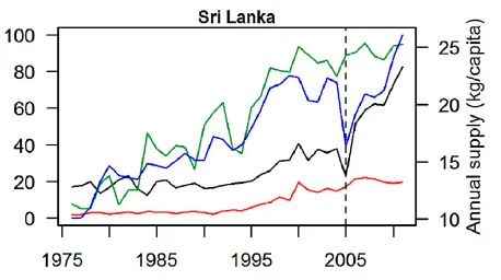 The data that Dr. Gephart included in her paper show a clear decline in fish production in Sri Lanka in 2005, right after the tsunami.
