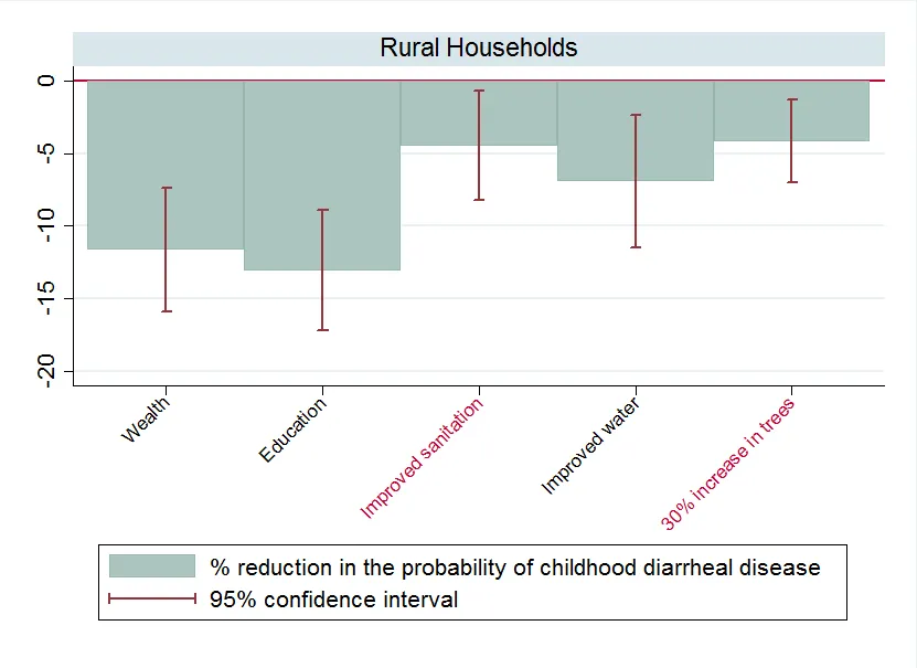 Surprisingly, the team predicts that a 30 per cent increase in upstream tree cover in rural watersheds would have a comparable effect to improved water sanitation, such as the addition of indoor plumbing or toilets.