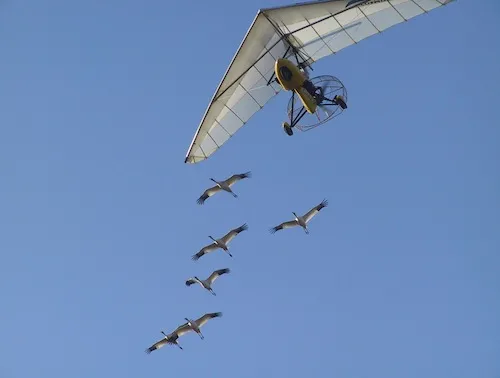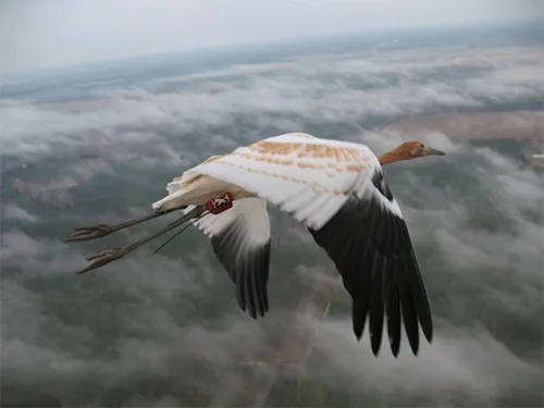 The Whooping Crane Eastern Partnership, made up of government and non-profit experts, has been working since 2001 to establish a second population in the Eastern U.S., which now numbers more than 100 birds. At Maryland’s Patuxent Wildlife Research Refuge and other captive breeding sites, adult whooping cranes produce chicks and biologists hand-raise them, using special methods designed to prepare the chicks for life in the wild. Each summer in a Wisconsin marsh, experts from the non-profit Operation Migration train a group of captive-raised chicks to follow an ultralight aircraft, using techniques like those portrayed in the fictional 1996 movie “Fly Away Home” to lead them on a 1,300-mile journey to their Florida wintering grounds.