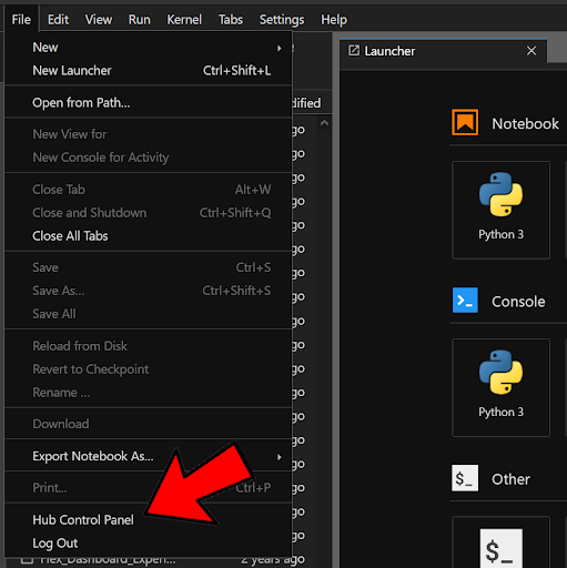 Now, you’ll need to stop your current Jupyter server (if running). Go to the drop-down menu File > Hub Control Panel.